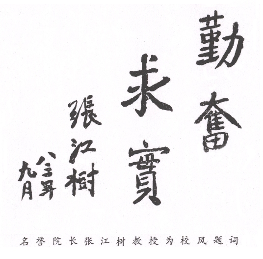 我校校训的形成,有着深厚的文化渊源,也印记着无比的艰辛,更饱含着面对未来发展的思索和追求。建校初期,学校几乎是一片空白,从江湾到梅陇,无论是满腹经纶的大师、博学多才的教师、勤劳朴实的职工还是意气奋发的学生,紧密团结在党委、院部领导之下,遵照毛主席、党中央的教育路线、方针,努力工作,艰苦创业。“没有会场,就在球场上席地而坐开会”、“没有饭厅,就在大草棚中开饭”、“工地上没有住宿,就睡地铺”,编制不足、用房紧张、实验条件简陋、交通不便,在极其艰苦的条件下开展校区建设和教学、科研工作。在师生员工的共同努力下,在建校八年之际就跻身进入全国64所重点大学。当时的华东化工学院的影响力是非凡的,在上级下发的大量文件中通常是这样称之:“复旦”、“交大”、“化工”,可见其实力和重要程度。一所白手起家的单科性化工院校何以与已有五六十年办学历史的老校齐名,不就是靠着一股子自强不息、奋发图强的干劲和一种持久不懈的拚搏精神?然而,从建校创业到1958年、到“文革”、到党的十一届三中全会召开之前,差不多跨越了近30年,我校从来没有提出过自己的校训(其他高校也是,即使有校训的学校,也都是建国以前定的,在改革开放之前都不兴用之),直到1982年建校30周年前夕,许多从建校初期就来化工学院的老同志,在一次座谈会上一致认为“勤奋、求实”这四个字是我们学校的好校风,是我们学校优良传统的集中表现。又过了一年的1983年9月,当时的名誉院长、86岁高龄的张江树教授为“勤奋、求实”校风题了词。由此可知,“勤奋、求实”更多的是在概括学校办学历史中形成的优良传统,并希冀继续保持和发扬这种好风尚,推动学校事业不断向前发展。