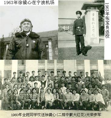 1960年夏,我校预科有3位学生投笔从戎、光荣参军,他们是预一(1)班的陆其昌、预一(2)班的张宝良和徐镜心,且都是空军飞行员。据预科校友会老同志回忆,当时,他们预科中先后共有24位同学加入了中国人民解放军,而这3位是我校历史上最早向人民军队输送的子弟兵。