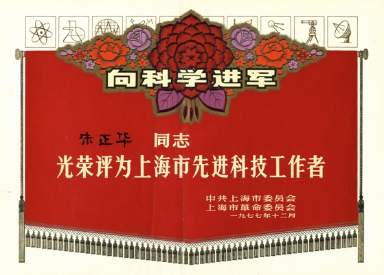 30年前,由于我校朱正华教授在科研工作中所作出的突出成绩,受到了中共上海市委员会的表彰,被光荣评为上海市先进科技工作者。与一年多前各级机构颁发的奖状不同,它一改清一色的“千万不要忘记阶级斗争!”、“坚持无产阶级专政下的继续革命!”、“深挖洞、广积粮、不称霸”等语录式版本,首次开始运用款式较为朴素、寓意较为贴切的奖状。如这张奖状在其上方添加了一些体现科学精神的图案,“向科学进军”虽然还是一句口号,但已经是有了质的改变,预示着极“左”思潮的影响正迅速瓦解,“实践是检验真理的唯一标准”正呼之欲出。我们知道,当年万恶的“四人帮”已被粉碎,禁锢在知识分子头上的桎梏已被砸烂,“科学的春天”即将到来。
