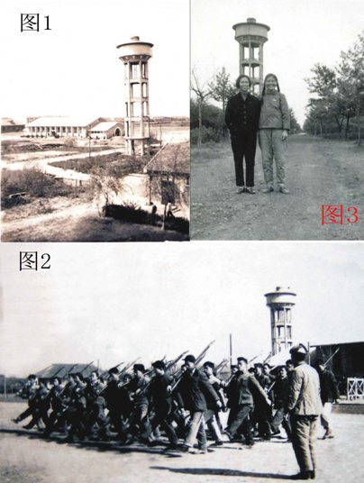 之二:我校50年代的大学生,扛着钢枪、昂首挺胸迈着整齐的步伐在冬天里参加军训,高高的水塔是当年的见证。远处的大棚屋已被现在的华理苑所替代。