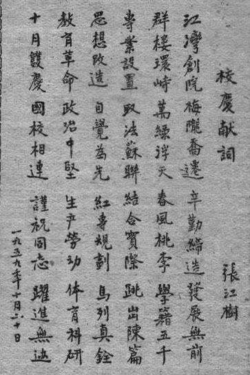 学校的各级领导纷纷撰写热情洋溢的纪念性文章:有时任党委副书记田辛同志的“欢呼光辉灿烂的十年”、张江树院长的“校庆献词”,前者从我们国家十年间工业、农业、国防、教育等方面取得的翻天覆地的变化作全面回顾,后者就我校建校七年里从无到有、从小到大所取得的成绩作总结。还有“在祖国的怀抱中成长”、“感谢党对我们的培养”、“我们站起来了”等颂扬文章,现在读来,依然令人精神振奋、斗志昂扬。当然,诗歌、散文也是赞美祖国面貌巨变的最好的方式:“普天同庆”、“祖国——我的母亲”、“淮河谣”、“做共产主义的好学生”等抒发了师生对祖国生日的衷心庆贺和良好祝愿。