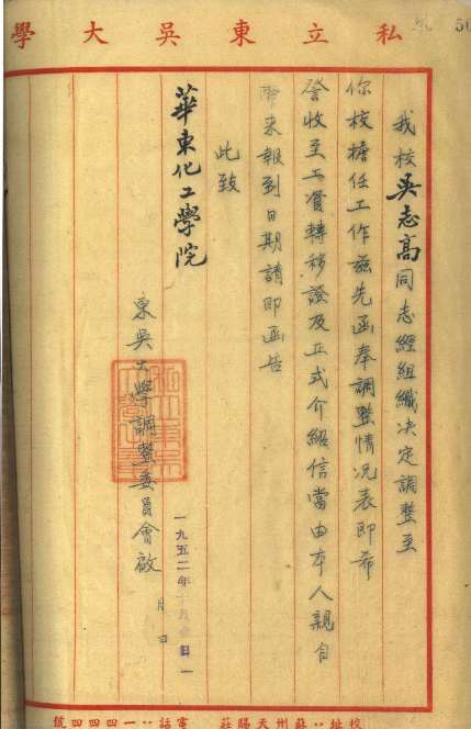 1952年7月8日,根据中央的指示,决定创建华东化工学院。8月12日,建校筹备小组召开第一次会议,确定成立秘书组、系科设置组、师资员工调配组、图书仪器设备组和校舍组,8月14日各组正式开始办公。