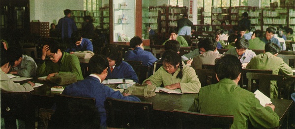 这幅照片拍摄于1979年,我校图书馆某阅览室一角。由图可知,用聚精会神、心无旁骛来形容同学们的学习劲头,是再合适不过的了。之外,那个时候学生的穿着非常朴素,拥有一套军便装、一只军挎包算是时髦的。