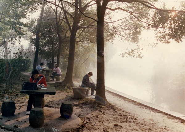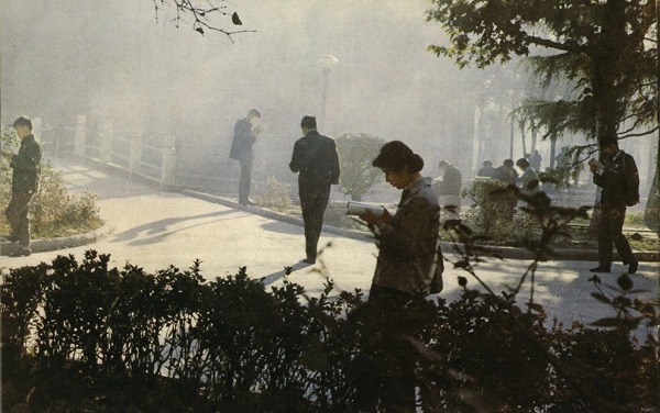 这幅照片拍摄于1986年,也说的是我校学生在小河边抓紧时间晨读。供同学们学习用的简陋石台、石墩已有之,但还没有石头铺板和草坪,河边也没有垃圾桶,以一只箩筐代之(凑巧,照片中没有看到被乱丢的垃圾,不过当时好像还很少有灌装饮料)。服饰上开始有“茄克衫”和“旅游鞋”出现。那时的学生,多数人还有一个装搪瓷碗和调羹(吃饭用的)的“布兜”(塑料马夹袋还未出现),拎着它去教室、图书馆和实验室,就是为了节约时间用于学习上。
