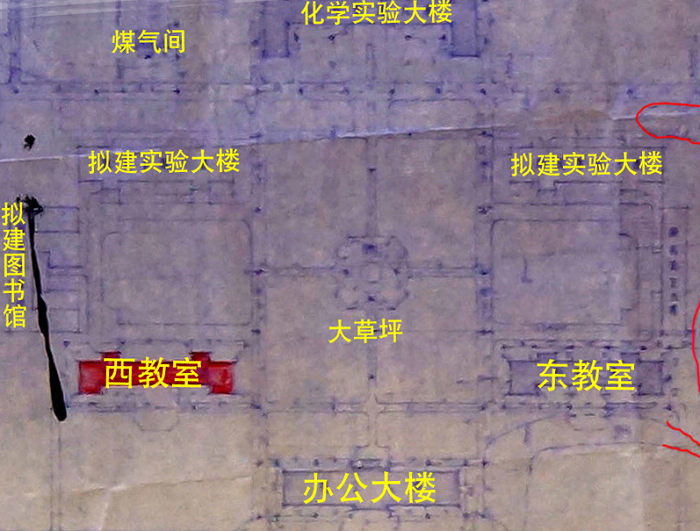 据此规划图推测,当时可能拟将该空地建成一个供师生休闲、散步或举行较大规模集体活动的广场更合乎情理——中间要建一个“花坛”或立一根“旗杆”,并有四条小径连通外侧的环道;另外,在其南侧,于1954年夏建成的和平楼(现办公大楼)的背面,有一个较大的露台(现已被“二会”所在的小楼封住),正对着北侧的广场,也与“首长”(当时对院长们或上级领导的尊称)在露台上忙里偷闲散散心、开阔一下视野、欣赏一下校园美景,或开大会时向广场上的师生们“发号施令”,均非常适宜。