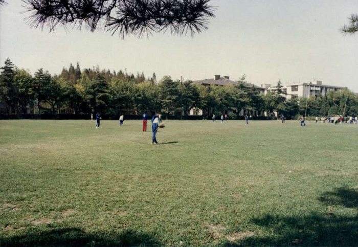 图片说明:1993年时的大草坪,学生在此踢足球。