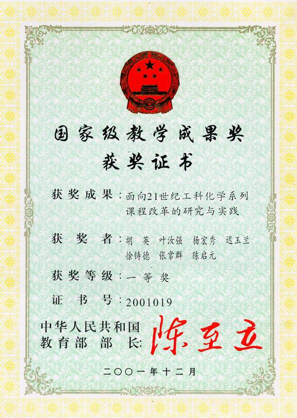 胡英的潜心教育改革和创新,结出了丰硕的果实。由他领衔、与国内其它高校联合承担完成的“面向21世纪工科化学系列课程改革的研究与实践”获国家级教学成果一等奖。由他主编的面向21世纪课程教材《物理化学》第4版,作为两段式化学理论课程教学改革的标志性成果,获得了国家级优秀教材奖一等奖。