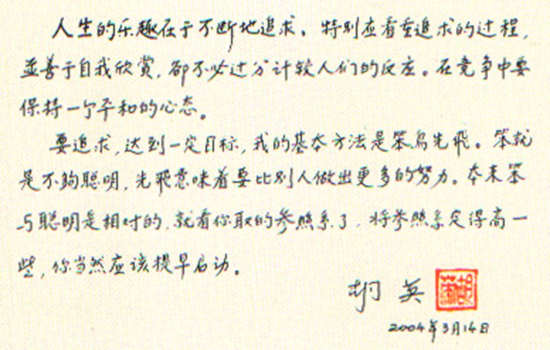 胡英是一个勤奋求实的人,一个拼搏上进的人。他有一段耐人寻味的格言:人生的乐趣在于不断地追求,特别应看重追求的过程,并善于自我欣赏,却不必过分计较人们的反应;在竞争中要保持一个平和的心态;要追求,达到一定目标,我的基本方法是笨鸟先飞,笨就是不够聪明,先飞意味着要比别人做出更多的努力,本来笨与聪明是相对的,就看你取的参照系了,将参照系定得高一些,你当然应该提早启动。这段格言不但是他的座右铭,也是他成就根基的写照。“文革”十年动乱期间,许多老师不是被卷入各种运动中就是被扣上反动学术权威的帽子而靠边站,教学、科研处于荒废状态。胡英则坚信总有一天知识是会重新受到重视,于是他坚持看书学习,积累相关领域的知识。由于他的坚持和勤奋,“文革”结束后,特别是改革开放后,他很快脱颖而出,成为学校教学科研的佼佼者。
