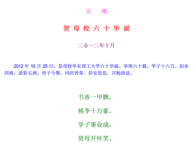 1968年8月毕业于我校无机物工学专业的黄纪祥校友,值母校60年校庆之际,特地新作五言诗“贺母校六十华诞”一首,以表心意:“华东理工,我为你骄傲;华东理工,你是我的自豪。祝母校生日快乐,蒸蒸日上!”
