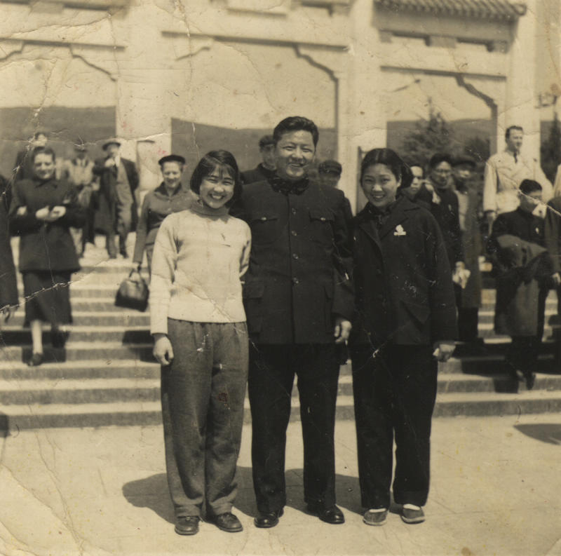 这张照片的来历是这样的。1957年刚开学,我校化学制药工学专业的徐传宁、舒允宜等同学去沈阳东北制药总厂做毕业实习,3月初结束返回上海时,刚巧徐传宁的姐姐在江苏省的团校集训(南京),且她的住处有空的床位可供留宿,于是她俩就在南京下了车,准备去游览一下中山陵。3月5日上午,正当徐传宁、舒允宜登上中山陵时,突然有一位中年人笑容可掬地招呼她俩,并问起“你们是华东化工学院的大学生?”(徐、舒两同学当时佩戴着校徽),“怎么来中山陵游览?”等。在陪同人员的介绍下,徐、舒两同学才知道面前的这位中年人是国家政务院的秘书长习仲勋同志,他刚好在陪同捷克斯洛伐克总理西罗基游览中山陵。习仲勋同志一是遇见新中国的大学生感到亲切,随意打个招呼,一是他要徐、舒两同学去向西罗基总理问个好,并希望向总理表达中国青年对社会主义阵营的捷克斯洛伐克青年们的友好情谊。徐、舒两同学与西罗基总理握手问好后,习仲勋同志就请新华社驻南京日报的记者拍摄下了这张合影照片。