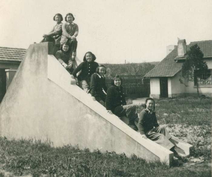 三、据建校元老回忆,当时这所学校的建筑还是很考究的,教室的窗户很大,采光而通风,且已经用上了当时还很少见的钢窗,屋顶多为斜坡尖顶,楼上、楼下均是木头地板,冬暖夏凉。从本次收集到的照片,也能看到整个学校有较高的围墙,但上端却有装饰孔,设计颇费用心。还有,为了丰富小学生课间活动,校园内建造了一座砖混结构的“斜卸梯”供孩子们玩耍。