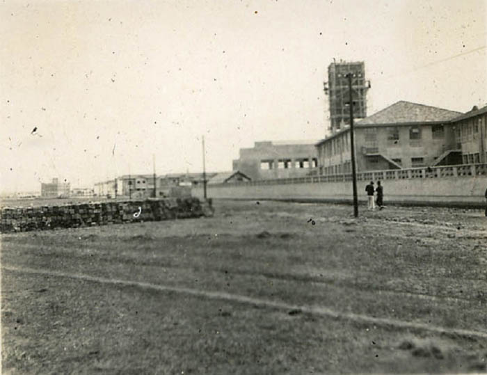 图片说明:建造中的日本国民第七小学-围墙、岗楼(1930 年代)