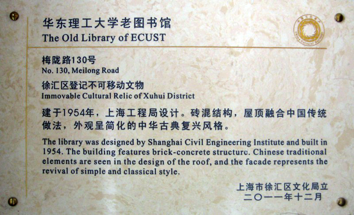 图片说明:老图书馆楼被徐汇区认定为不可移动文物的铭牌