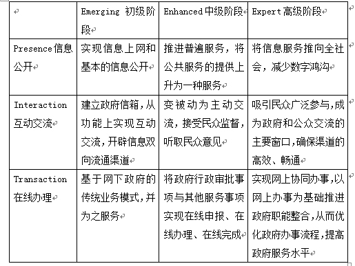 北京大学网络经济研究中心、北京大学光华管理学院与计世资讯研究和借鉴国外优秀电子政务评价体系,基于我国电子政务现实阶段的需要和特征,于2006年提出一种双维度、多层次的政府网站测评体系,简称为PIT-EEE。其中“PIT”指的是“presence”(信息公开)“interaction”(互动交流)transaction(在线办理),三个“E”分别指的是emerging(初级),enhanced(中级),expert(高级)。据此可以看出在该体系下,电子政务拥有信息公开、互动交流和在线办理三大功能以及初级、中级、高级三个发展阶段,三大功能与三个发展阶段的衔接点就是所提供电子政务典型服务的难易程度和重要程度。如下图所示: