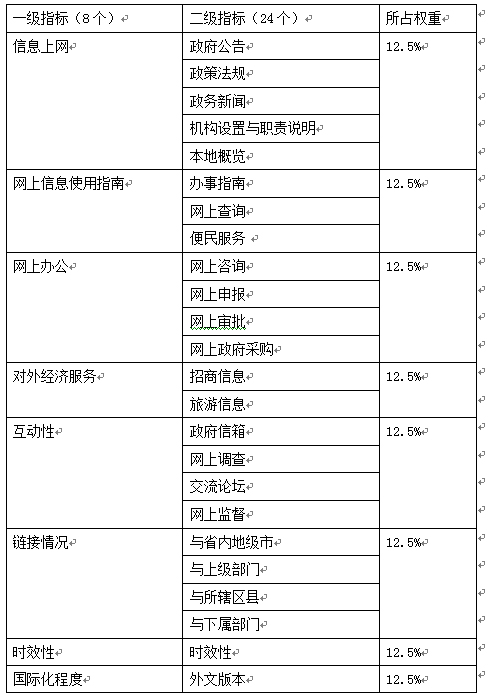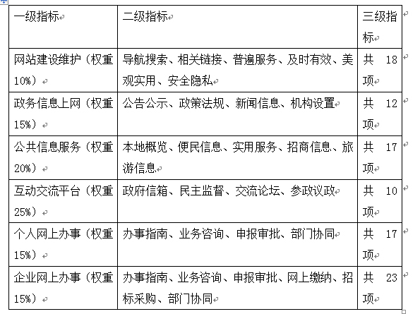 “网站建设维护”这个指标从以下几个方面考察:导航搜索,考察政府门户网站的导航功能和搜索功能,这部分对于原有指标的要求更加具体严格,包括网站地图、站内搜索、站内导航等三级指标。相关链接,考察政府门户网站的相关链接功能,有与下属部门、所辖区县、上级部门、兄弟城市等网站的链接。普遍服务,考察政府门户网站是否对公众提供普遍服务,包括文字、使用帮助和服务平台拓展等的考察。及时有效,考察网站对于新闻、法规的公布是否有效。美观实用,考察网站访问页面的速度、公众的可读易读性、页面订制等功能。安全隐私,考察网站在维护公众隐私方面的功能,如是否设置安全条款、采取安全措施和隐私保护。“政务信息上网”从以下方面考察:公告公式,考察政府能否准确公布政府公告、人事任免等;政策法规,考察对国家、地方政策法规的准确发布情况;新闻信息,考察网站对新闻的发布情况和重大专题的学习情况;机构设置,考察对政府机构设置的介绍情况,包括对部门的介绍和领导的联系方式以及部门的工作动态。“公共信息服务”从以下方面考察:本地概览,考察网站对当地概览和具体统计资料的公布质量;便民服务,考察对公众生活细小方面的服务情况,从天气、就业、市政等方面进一步分析;实用服务,考察网站中电子地图、三农服务、数字城市等的服务质量;招商信息,考察网站的招商政策、投资指南、分类招商信息等功能;旅游信息,考察关于景点介绍、路线介绍和投诉反馈等功能的情况。“互动交流平台”从以下方面考察:政府信箱,考察信箱的建设质量;民主监督,考察投诉功能;交流论坛,考察官员在线论坛和公众网上论坛的建设;参政议政,考察网站公众参与的网上听政和意见征询等功能。此外,还有“网上办事”,考察的对个人和企业网上办事的指导效果。