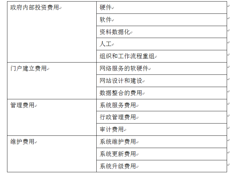 所谓成本,指主体为获得收益所付出的必要代价,而电子政务作为时下政务发展的潮流,它的成本就是在开发、使用、管理维护中投入的人、财、物。具体包括:政府内部投资费用、网络入口建立费用、管理费用和维护费用。如下图所示: