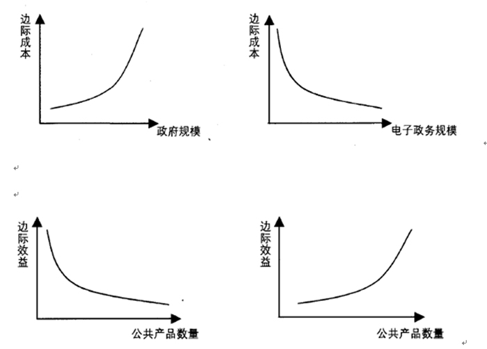上左图表示传统政务边际成本与政府规模的曲线,上右图表示的是电子政务边际成本与政务规模的曲线关系,下左图表示传统边际效益的变化,下右图表示的是电子政务环境下边际效益的变化情况。