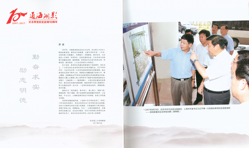 《通海湖影》画册分为“规划建设、教书育人、凝心聚力、青春飞扬、旖旎校园”等5个篇章,选用了200多张见证奉贤校区传承拓展追求卓越、教职员工潜心从教精心育人和莘莘学子遨游学海扬帆起航的生动图片,以铭记校区建设的发展印记,感念创业往者的如歌激情,激励来者不忘初心砥砺前行,努力在建设世界一流大学、一流学科的新征程中,再展新卷,再书华章。