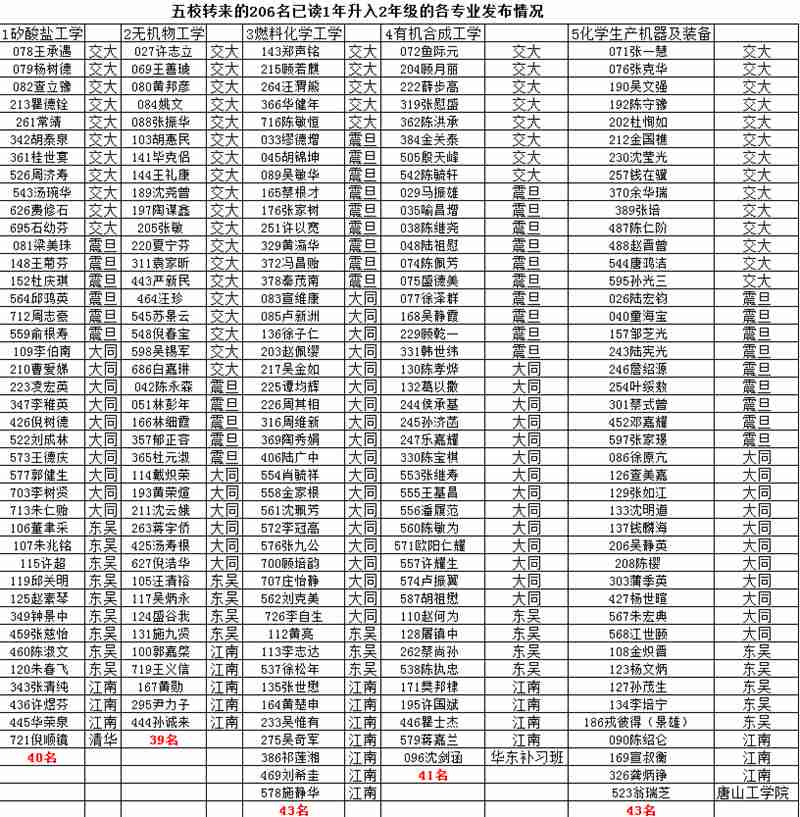 附表1:五校转来的206名已读1年升入2年级的各专业分布情况
