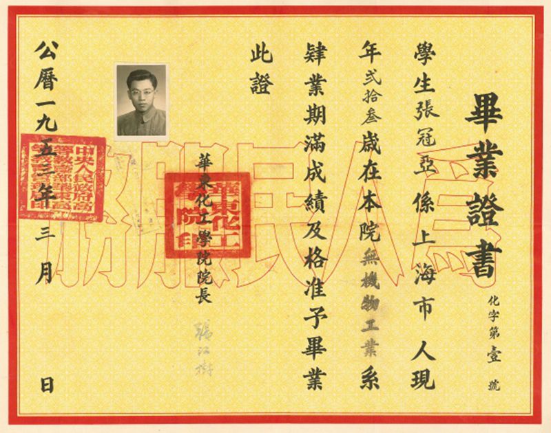 图片2:华东化工学院颁发给张冠亚的首张毕业证书(化字第壹号)
