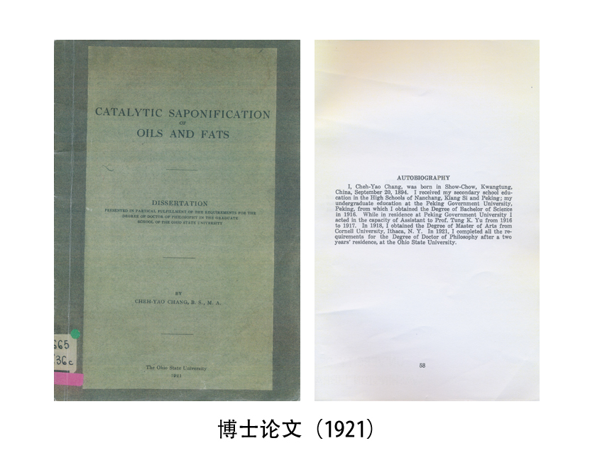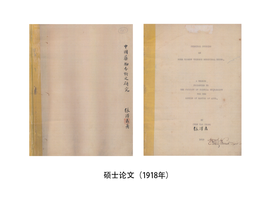 在北京大学化学系学习期间,张泽垚每学期皆名列第一,凭借着奖学金完成了学业。因成绩优秀,1916年毕业后留校,成为著名化学教育家俞同奎教授的助手。一年后公派赴美留学,1918年获康乃尔大学卫生化学硕士,完成论文《中国药物分析之研究》,尝试用西方科学的方法分析博大精深的中医药材。1921年获俄亥俄州立大学工业化学博士学位,完成论文《油类接触碱化论》,留学期间曾获美国科学会、化学会奖章。机缘巧合,1942年张泽垚先生的长子张德骏(农业工程学家,吉林工业大学教授)公费留美,他的导师也正是当年张先生的老师。谈到对张泽垚先生的评价时,不是简单地用Good,Very Good, Excellent,而是说他从没见过如此优秀的学生。如今,论文封面和扉页上张泽垚先生100年前用毛笔书写的论文题目和签名依然墨色如新,见证了中国文化孕育的中国学生与欧美学生相比毫不逊色。