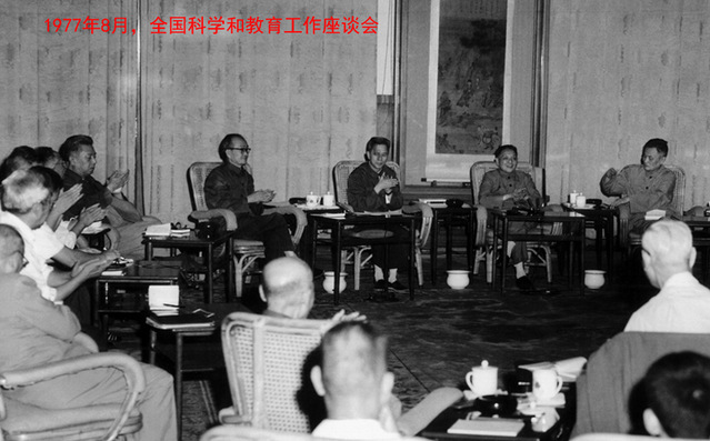 1977年7月17日邓小平复出,任中央委员、政治局委员、常委、国务院副总理等职,并分管科技、教育工作。8月4日,中央(邓小平)邀请(主持)科学院系统和高等院校的33位专家学者在人民大会堂召开科学和教育工作座谈会;6日,根据参会者的强烈建议,邓小平作出了当年应当恢复高考的决策。