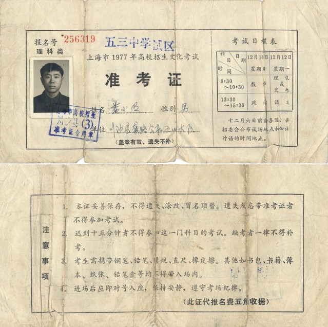 另外,1977年底上海的高考于12月11、12两日进行,考试科目为政治、语文、数学和史地(文科)、理化(理科)4门,大专院校与中等专业学校考生同用一张试卷,依次择优录取;1978年7月,上海大专院校、中专和技校的考试同时进行(前者20、21、22日考,后者26、27日考),但考卷分开,且科目也有所变化:大专院校考生的理化和史地分成两门来考(总共为5门),而中专和技校的考生不分文、理科,考政治、语文、数学、理化4门。这样一来,半年前落榜的不少考生,为了保险起见,只好“退而求其次”,选择“兜底”的办法,报考“中等专业学校”了(那时没有平行志愿,但同类学校间可以少量调剂)。还有,1978年的考生年龄放宽到了30周岁,婚否、高中毕业与否等门槛均被取消。