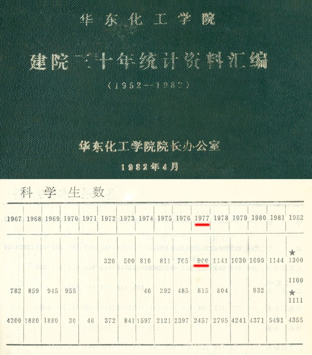 《中共华东化工学院党史大事记(1952~1987年)》之1978年3月4日条目记载:“‘文革’后恢复统考招生。本院1145名新生举行开学典礼。”而下图上所列数据为900名,出入245名。