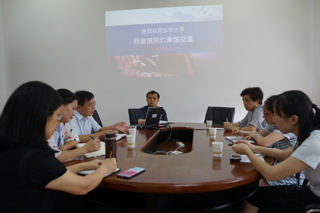 9月9日下午,东华大学档案馆馆长沈洁、原信息办副主任徐萍等一行3人来校调研档案信息化工作。我校档案馆馆长王惠文、副馆长段义严等参加座谈交流。
